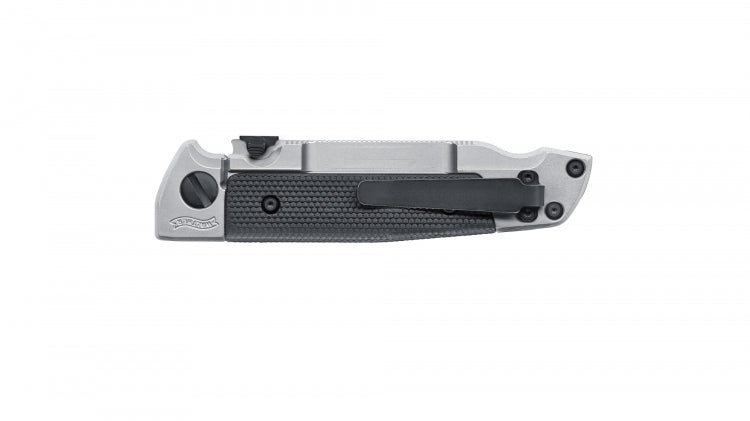 The Walther Q5 Steel Frame is a classic tactical folding knife, unmistakably inspired by the successful Walther Q5 Steel Frame match pistol's design. Much like the Q5 SF, this steel-framed locking knife features intricate checkering on the underside, ensuring a secure grip. The one-piece GRP handle overlay replicates the original pattern and texture, delivering excellent control in various hand positions. Despite its substantial size, the Q5 Steel Frame maintains a slim profile, and its reversible pocket clip allows for easy pocket carry. Notable details such as the ambidextrous thumb stud, resembling the style of the magazine catch, add distinctive accents. When it comes to edge retention, the satin-finished blade crafted from robust D2 steel leaves nothing to be desired.